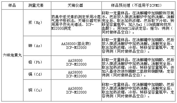 天瑞儀器參考《中華人民共和國藥典》,采用原子吸收光譜儀(AAS6000;AAS8000)、原子熒光光譜儀(AFS200系列)、電感耦合等離子體質譜儀(ICP-MS2000),對六味地黃丸中鎘、鉛、銅、砷、砷、汞等重金屬的測定進行研究,測試結果準確度高,重復性好。