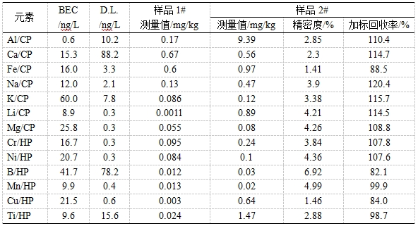 參考《GB/T 32650-2016 電感耦合等離子體質(zhì)譜法檢測石英砂中痕量元素》進行樣品前處理。利用冷焰模式及標(biāo)準(zhǔn)模式對樣品進行測試,考察背景等效濃度(BEC)、方法檢出限(D.L.)、加標(biāo)回收率、精密度。背景等效濃度在0.6ng/L~60.0ng/L之間,方法檢出限在0.3ng/L~88.2ng/L之間,加標(biāo)回收率在82.1%~120.4%之間,精密度在1.41%~6.92%之間。