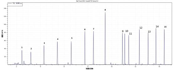 1.正己烷 2.苯 3.三氯乙烯 4.甲苯 5.辛烯 6.乙酸丁酯 7.乙苯 8.對(間)二甲苯9.鄰二甲苯 10.苯乙烯 11.壬烷 12.異辛醇 13.十一烷 14.十四烷 15.十六烷