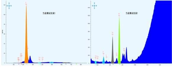 圖3為測試中使用的一個未知樣(命名石油焦1#)的測試譜圖,在譜圖中可以明顯觀察到S、V、Fe、Ni元素的特征峰,并且在此樣品中還含有微量的Al、Si、Ca、Zn元素。使用該樣品進(jìn)行重復(fù)性測試后,檢測結(jié)果中S、V、Fe、Ni元素的重復(fù)性分別達(dá)到了0.28%、3.33%、1.10%和0.71%,表明該儀器對石油焦樣品具有很好的檢測效果。