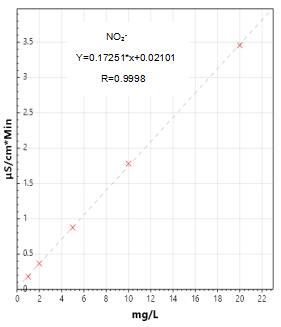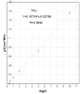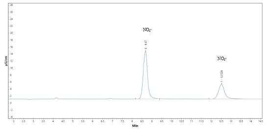 4.亞硝酸鹽及硝酸鹽測試曲線譜圖詳見圖3-1、3-2,標準樣品譜圖及實際樣品加標測試的譜圖見圖4-1、4-2。