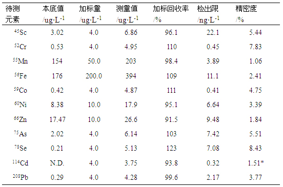 本實驗采用天瑞儀器ICP-MS 2000E測定地表水質中鐵、鉻、砷、錳、鎘、鉛等元素的含量,利用He/H2混合氣作為碰撞反應氣,降低氬基相關多原子離子干擾,測試方法檢出限、準確性與穩定性滿足標準要求。